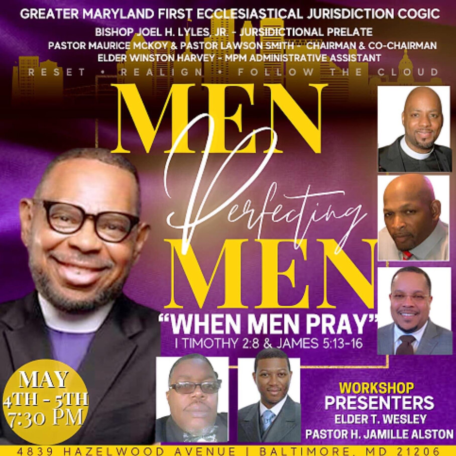 Men Perfecting Men (Jurisdictional Men's Conference)Thursday, May 04, 2023, 7:30 AM - Friday, May 05, 2023, 9:00 AM Location: Greater Emmanuel Ministries Church of God In Christ, 4839 Hazelwood Ave, Baltimore, Maryland, Baltimore, MD US 21206Add to CalendarPrevious Page