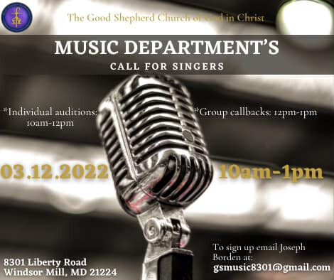 Music Department Auditions Saturday, March 12, 2022, 10:00 AM - 1:00 PM Location: The Good Shepherd, 8301 Liberty Road, 21244Add to CalendarPrevious Page